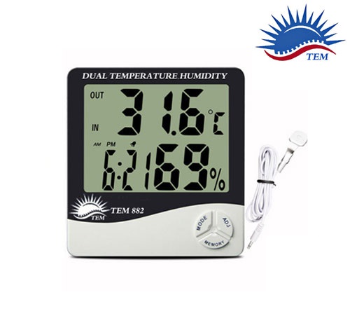 دماسنج و رطوبت سنج دیجیتالی مدل TEM-882، ترموهیگرومتری رومیزی ودیواری جهت نمایش دما و رطوبت محیط با استفاده از سنسور داخلی وخارجی می باشد. علاوه بر آن این ترمومتر و هیگرومترمحیطی ،قابلیت نمایش تاریخ یاساعت را نیز دارد. رطوبت سنج و دماسنج ماکزیمم ومینیمم tem-882 توانایی نمایش دمای دو محیط را بدون نیاز به زدن دکمه ای یا تنظیمات خاصی دارد . بدین صورت که دمای اندازه گیری شده بوسیله سنسور داخلی و خارجی با وقفه ای ۵ ثانیه ای بصورت مداوم روی صفحه نمایش تعوض خواهد شد.