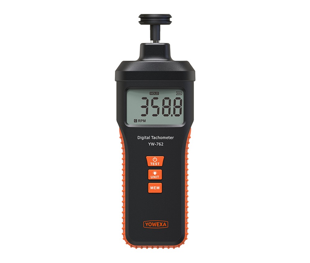 دستگاه دورسنج لیزری و مکانیکی(تماسی) YOWEXA مدل YW-762 این دور سنج هم بصورت تماسی و بصورت لیزری میتواند دورسنجی کند . دقت این دور سنج ±(۰.۵% reading+5) میباشد .رنج دستگاه در حالت نوری ۰.۱~۶۰۰۰.0Hz و در حالت تماسی ۱.۰~19999RPM میباشد. دورسنج سرعت دوران، سرعت خطی و تعداد دور اجسام دوار را می تواند اندازه گیری کند و با توجه به قابلیت تماس با اجسام به دو دسته تماسی و غیرتماسی تقسیم می شوند. از کاربرد های متنوع دورسنج می توان به اندازه گیری سرعت موتور های دوار غیر قابل دسترس، فن های متحرک، پمپ ها، صنایع خودرو و… اشاره کرد.این سری از دستگاه دارای سه مدل YW-762, YW-762f و YW-762j می باشد که مدل YW-762 از دو قابلیت اندازه گیری تماسی و غیر تماسی پشتیبانی می کند. محدوده موثر برای استفاده از قابلیت اندازه گیری غیرتماسی این دستگاه از ۵۰ تا ۵۰۰ میلی متر می باشد. این دستگاه به یک صفحه نمایش بزرگ LCD به همراه نور پس زمینه مجهز شده است که باعث افزایش بازدهی کار در محیط های کم نور و تاریک می شود. همچنین این دستگاه دارای گواهی IP43 می باشد که به معنی مقاومت در برابر ذراتی به قطر ۱ میلی متر می باشد، همچنین در برابر اسپری شدن آب با زاویه ۶۰ درجه چه به صورت افقی و چه عمودی نیز مقاوم است.